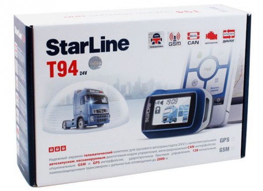 Автосигнализация StarLine Т94 T2.0, являющаяся телематическим охранным комплексом, используется для защиты грузовых и других транспортных средств, напряжение бортовой сети которых составляет 24 Вольта. Охранная система автомобильной сигнализации оборудована диалоговым несканируемым кодом управления и интегрированным интеллектуальным автозапуском. В сигнализацию встроен 128-полосный помехозащищённый приёмопередатчик, обеспечивающий стабильную бесперебойную работу при воздействии городских радиопомех. Благодаря диалоговому коду управления обеспечивается надёжная защита от электронного взлома.