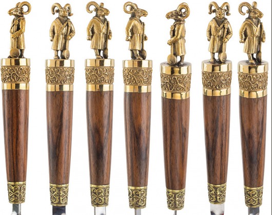 • Особого внимания заслуживает ореховая рукоятка с литым бронзовым фигурным наконечником. Каждая фигурка — это автроская ювелирная работа. Ручка крупная, массивная, хорошо лежит в руке и при этом не перевешивает шампур.