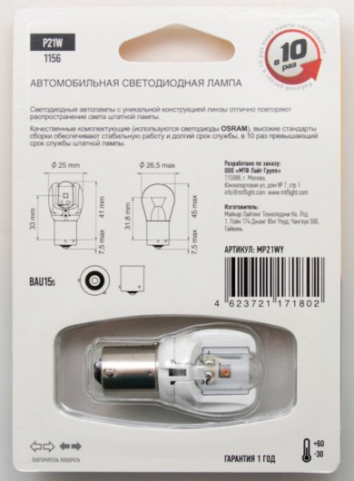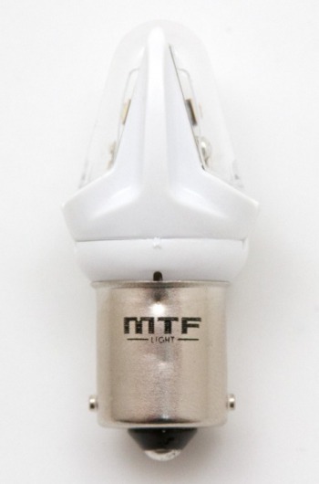 Светодиодная лампа MTF Light P21W с уникальной конструкцией линзы отлично повторяет распространение света штатной лампы. Цвет свечения автолампы: желтый.