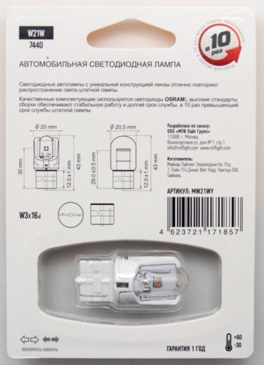 Светодиодная лампа MTF Light W21W 2W с уникальной конструкцией линзы отлично повторяет распространение света штатной лампы. Цвет свечения автолампы: желтый.