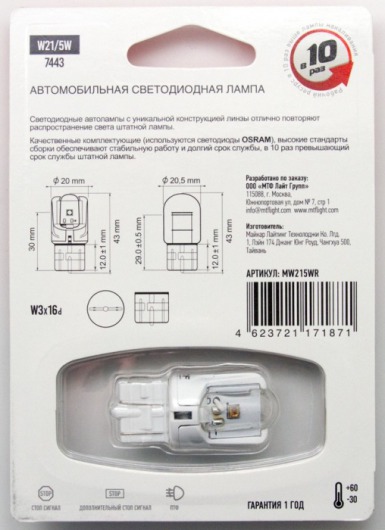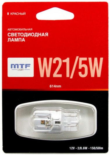 Светодиодная лампа MTF Light W21/5W 2/0.6W с уникальной конструкцией линзы отлично повторяет распространение света штатной лампы. Цвет свечения автолампы: красный.