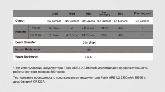 Fenix CL25R предлагает своим пользователям шесть рабочих режимов на выбор. Из них четыре относятся к освещению белым светом и два — красным. Яркость света в выбранном вами режиме поддерживается благодаря работе специального контроллера.