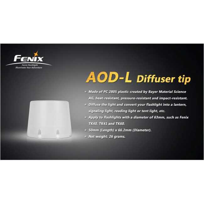 Специально для мощных тактических фонарей компания Fenix выпустила диффузионный фильтр белого цвета. Этот фильтр рассеивает узконаправленный луч света таким образом, чтобы фонарь можно было использовать для освещения территории палаточного лагеря.