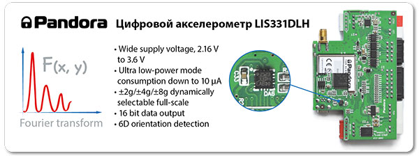 В Pandora 5910 применен совершенный 3-х координатный акселерометр c цифровым интерфейсом LIS331DLH от компании STMicroelectronics, который используется в топовых современных смартфонах, таких как Iphone 5. Кроме того, применены совершенные математические алгоритмы, используемые в геодезических приборах и навигации быстродвижущихся объектов в космонавтике и современной авиации.