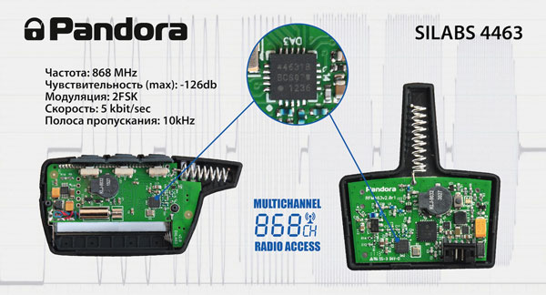 В системе применен абсолютно новый радиотракт основой для которого послужил новейший интегральный трансивер SI4463. Новый радиотракт использует радиодиапазон 868MHz с 12 независимыми каналами, c очень узкой шириной полосы пропускания (не более 10KHz). Чем уже полоса пропускания, тем выше реальная помехозащищенность и дальность связи. Дальность канала управления системы 5910 почти вдвое превосходит дальность предыдущей Pandora 5000. Дальность канала оповещения увеличилась еще больше. При этом мощность работы передатчиков RF-модуля и брелока не превышают нескольких десятков милливатт!