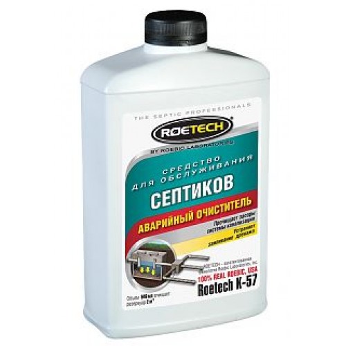 Аварийный очиститель септика. Сильнодействующий биологический продукт для быстрой прочистки сильно заиленных, переполненных и запущенных септиков, сточных колодцев, дренажных труб. Roetech К-57 не портит сливы, трубы, керамику, поскольку не содержит активных коррозирующих веществ.