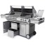 Гриль разделен на две независимых части, каждая под отдельной крышкой. Основной отсек имеет 4 основных горелки с перекрестным зажиганием защищенные пластинами-испарителями. Имеется инфракрасная горелка для вертела. Сам вертел с электроприводом идет в комплекте. Встроенный лоток для щепы с отдельной горелкой позволяет коптить без дополнительных аксессуаров.