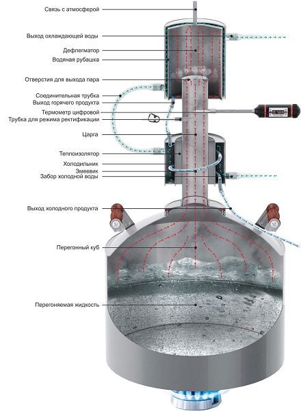 Функцию сухопарника теперь выполняет колонна, а холодильник (дефлегматор), расположенный в её верхней части стал прямоточным, и состоит из стакана и охлаждающей водяной рубашки. В верхней части стакана имеется штуцер связи с атмосферой, используемый в режиме ректификации или для установки термометра в режиме дистилляции.