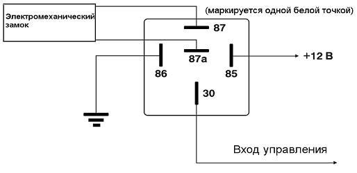 Запирание замка - при подаче отрицательного уровня (ок), на вход (30) реле, на контакте 87 появляется импульс 1 сек. напряжением +12В, а на контакте 87а - минус 1сек.