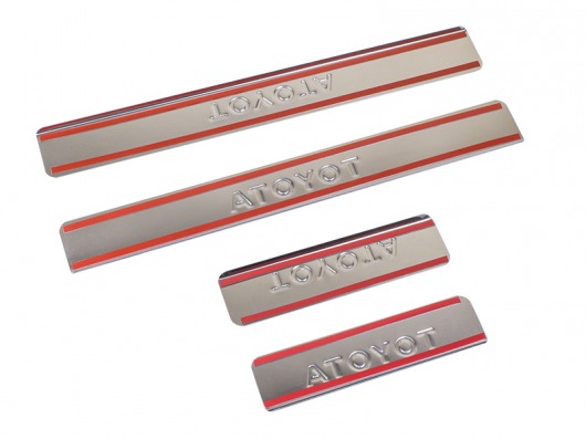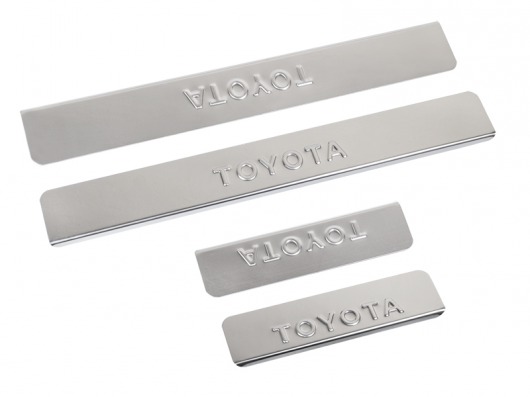 Накладки на металлические пороги дверей Toyota RAV 4 с логотипом авто не только обеспечивают защиту верхней и боковой поверхности внутреннего порога, но и отлично вписываются в интерьер автомобиля, подчеркивая его стиль и индивидуальность. C монтажом проблем не возникнет: установка накладок на внутренний порог для Тойота РАВ 4 производится на штатные места с помощью скотча 3M.