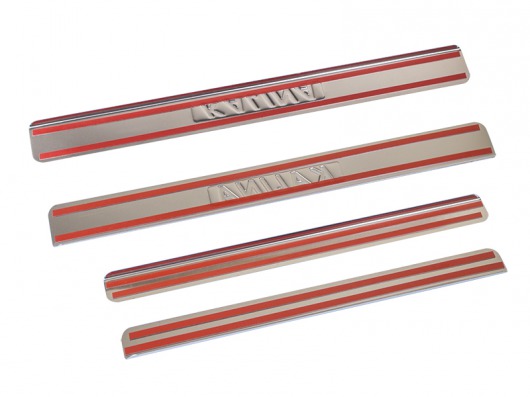 Накладки на металлические пороги дверей ВАЗ 1118 с логотипом авто не только обеспечивают защиту верхней и боковой поверхности внутреннего порога, но и отлично вписываются в интерьер автомобиля, подчеркивая его стиль и индивидуальность. C монтажом проблем не возникнет: установка накладок на внутренний порог для ВАЗ 1118 производится на штатные места с помощью скотча 3M.