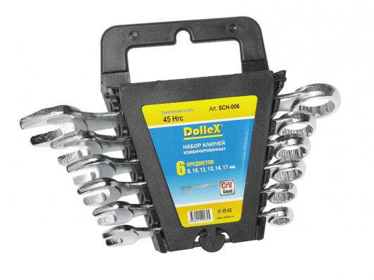 Dollex SCH-006 — это набор комбинированных гаечных ключей, состоящий из 6 инструментов  – от 8 до 17 мм. Комбинированные ключи Dollex SCH-006 хранятся в удобном пластиковом держателе, в котором все ключи расположены строго по размеру.