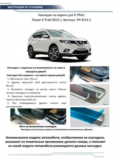 Данные накладки на внутренние пороги «Риваль» разработаны специально для автомобилей Nissan X-trail от 2015 г.в. и полностью повторяют их геометрию. Кроме того, накладки порогов двери Rival очень легко и быстро устанавливаются. И при этом надежно крепятся за счет плотного прилегания морозостойкого скотча.