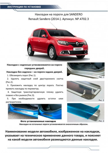 Вопросы и отзывы про Накладки на пороги для Renault Sandero от 14 г.в. (Rival)