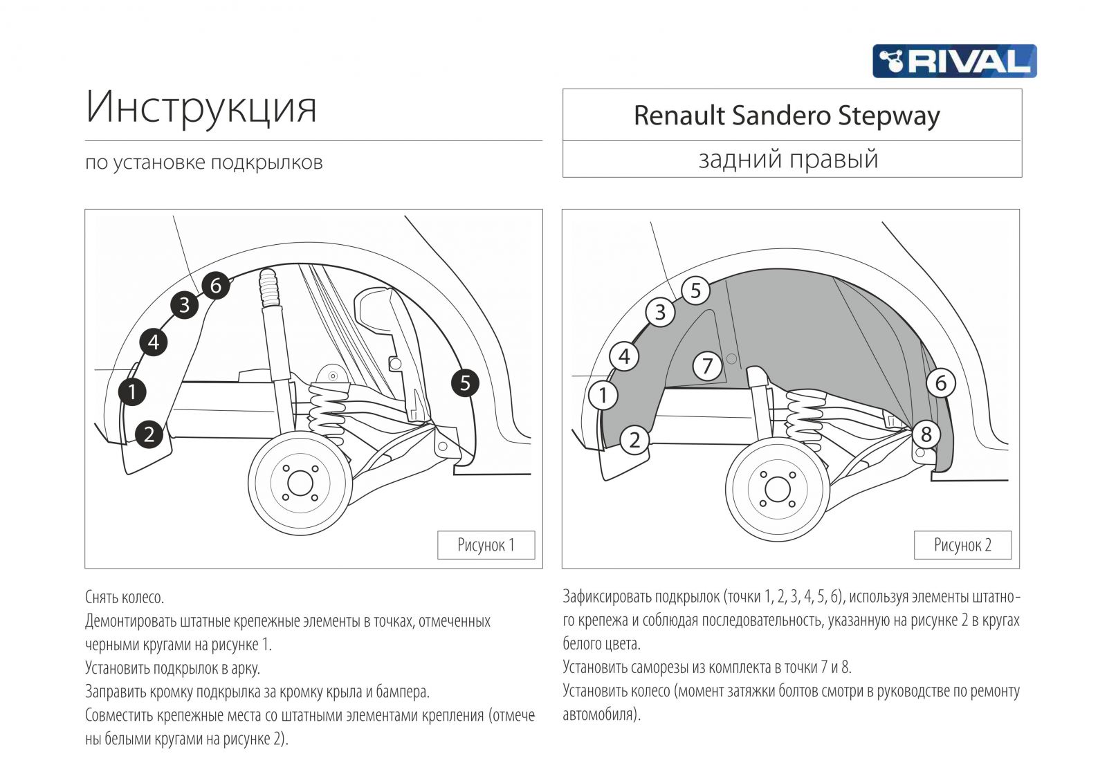 Правый задний подкрылок — это отформованный ударопрочный кожух, который является важной защитной деталью авто. Данный подкрылок крепится сзади с правой стороны. Задний локер разработан специально для автомобилей Renault Sandero Stepway от 2014 г.в. Благодаря этому он идеально повторяет форму ниши колеса, просто устанавливается, а все технологические отверстия правого подкрылка совпадают со штатными местами крепления.