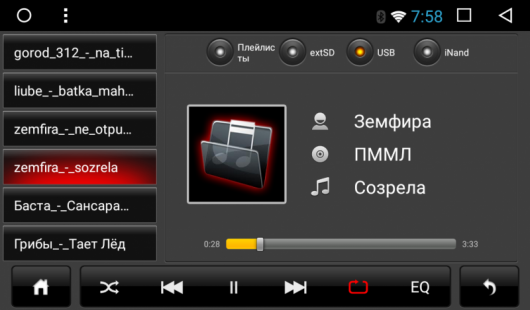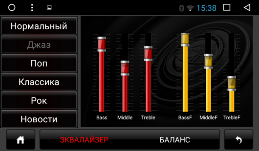 В аудиотракте мультимедийной системы используется 3-полосный эквалайзер. Встроенный усилитель мощностью 4x45 Вт построен на MOSFET транзисторах, а для любителей более мощного звука предусмотрены линейные выходы - фронт, тыл, сабвуфер.