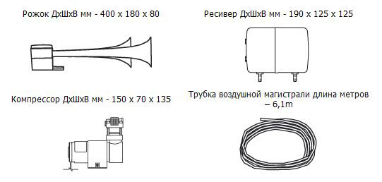 Комплект KIT 961это ярковыраженный бас на службе Вашего автомобиля. Вы можете разместить устройство под капотом или снаружи автомобиля на свое усмотрение. Основные запчасти можно расположить в разных частях машины: рожок, конечно же, ставится в передней части машины, а вот ресивер и компрессор — в багажнике либо салоне (если нет места в моторном отсеке).