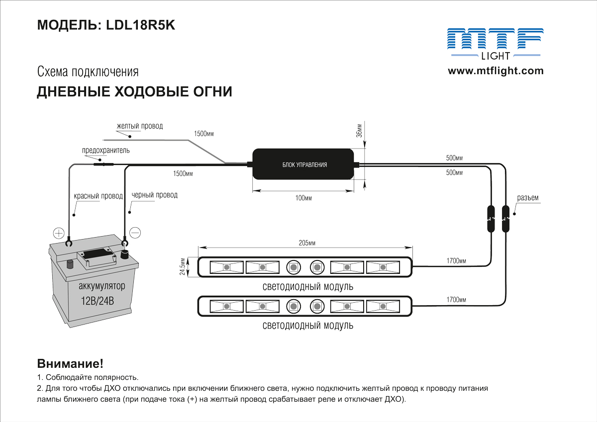 Благодаря специальному датчику, огни загораются, как только Вы поворачиваете ключ зажигания. А когда Вы включаете ближний свет или габаритную подсветку, светодиоды LDL18R5K автоматически перестают работать. Уникальный встроенный микрочип контролирует работу огней в зависимости от того, включен двигатель или нет.