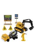 Игровой набор "Стройка", состоящий из 2 машин - трактора и бетономешалки, фигурки строителя и дорожных знаков, можно использовать как для соединения с другими элементами конструктора Мега Сити, так и для самостоятельной игры.