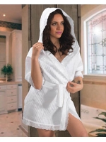 Уютный халат с капюшоном в изысканном Французском стиле. Нежная махровая ткань с добавлением бамбуковой нити. Изысканная отделка сатиновой тканью всего пояса. Скругленные полы халата с разрезами по бокам. Полы халата, капюшон и рукава украшены кружевной бейкой.